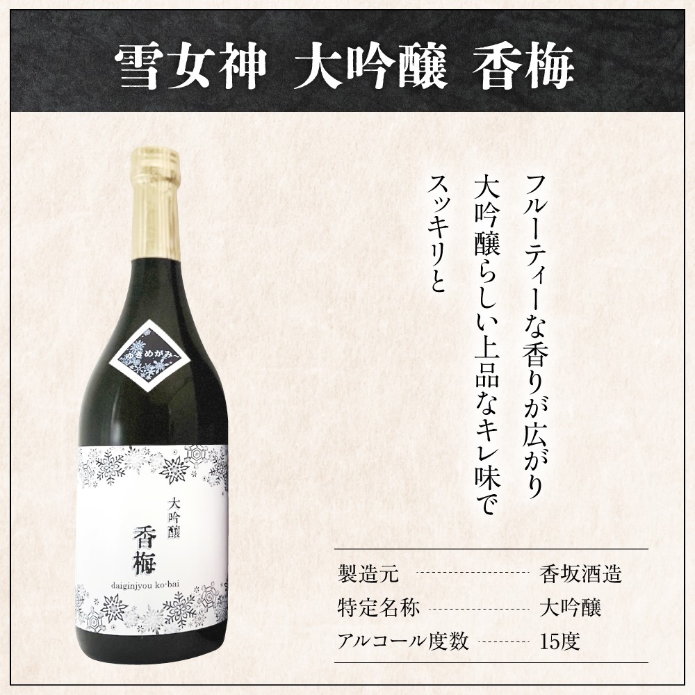 | 容量 | 計3本 ・東光 純米大吟醸雪女神:720ml×1本 ・九郎左衛門 大吟醸雪女神:720ml×1本 ・香梅 大吟醸雪女神:720ml×1本 |