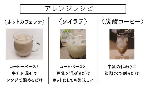 カフェオレ: コーヒーベースと牛乳を1:3〜4の割合で混ぜる。ホットはレンジで温め、アイスは氷を入れても。