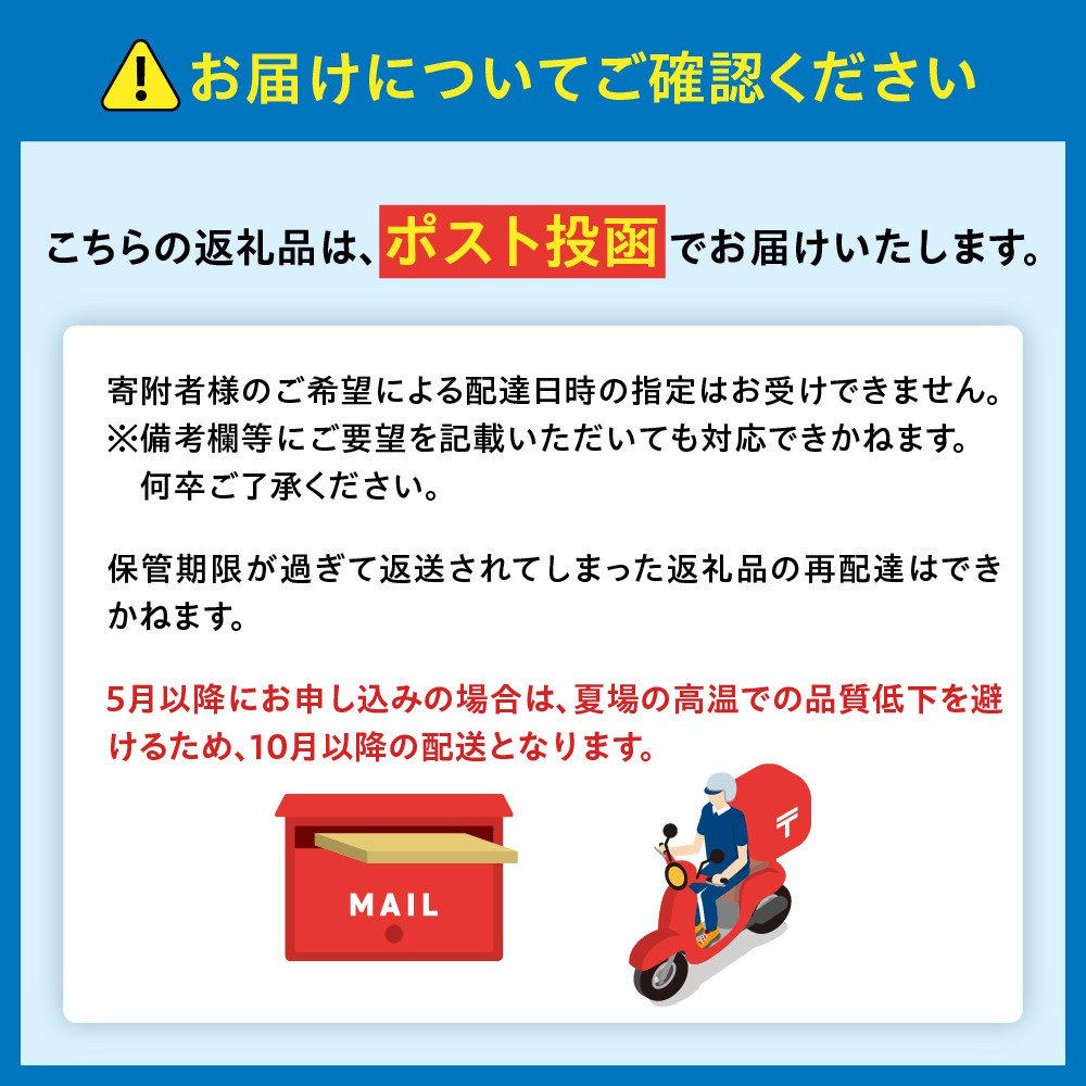 入金確認から1ヶ月程度 ※ポスト投函の返礼品となります。 5月中旬以降のお申し込みは、夏場の高温での品質低下を避けるため、10月以降の配送対応となります。 【発送不可の期間について】 長期連休、お盆、年末年始の発送はお受けできません。 ※ご入金方法によっても異なります。 |