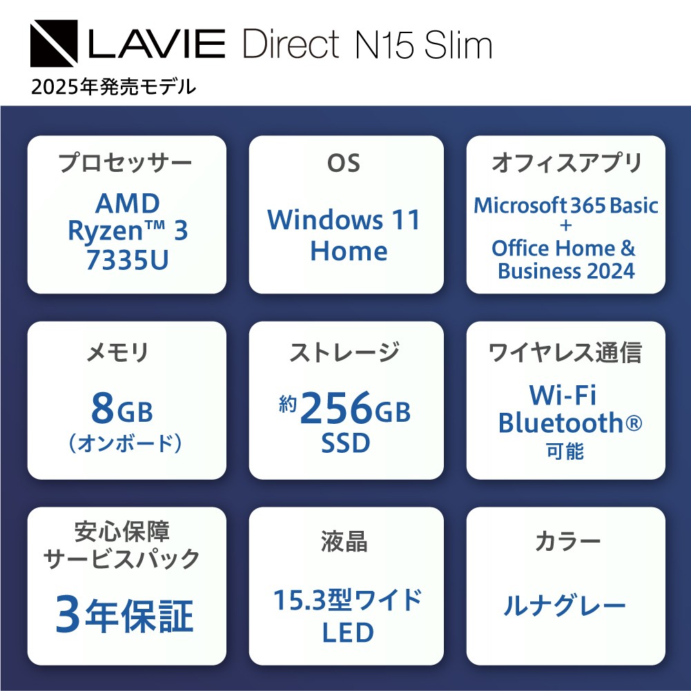 | 容量 | 2025年発売モデル NEC LAVIE Direct N15Slim-③ ・AMD Ryzen™ 3 7335U プロセッサ ・Windows 11 Home ・15.3型ワイド LED IPS液晶(WUXGA 1920x1200ドット) ・カラー ルナグレー ・Wi-Fi 7対応(IEEE802.11be/ax/ac/a/b/g/n) ワイヤレスLAN + Bluetooth® ・メモリ8GB (オンボード 8GB) ・約256GB SSD ・DVD/CDドライブなし ・Microsoft 365 Basic + Office Home & Business 2024 ・あんしん保証サービスパック 3年版 |