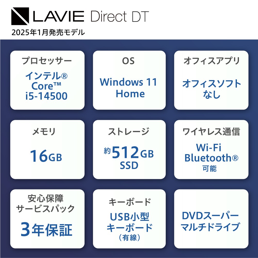 | 容量 | LAVIE Direct DT 2025年01月発売モデル DT ・インテル® Core™ i5-14500 プロセッサー ・Windows 11 Home ・USB小型キーボード(有線)・USBレーザーマウス(有線) ・16GB (8GB×2)メモリ ・約512GB SSD ・DVDスーパーマルチドライブ ・Wi-Fi 6E対応 (IEEE802.11ax/ac/a/b/g/n) + Bluetooth® ・オフィスアプリなし ・あんしん保証サービスパック 3年版 |