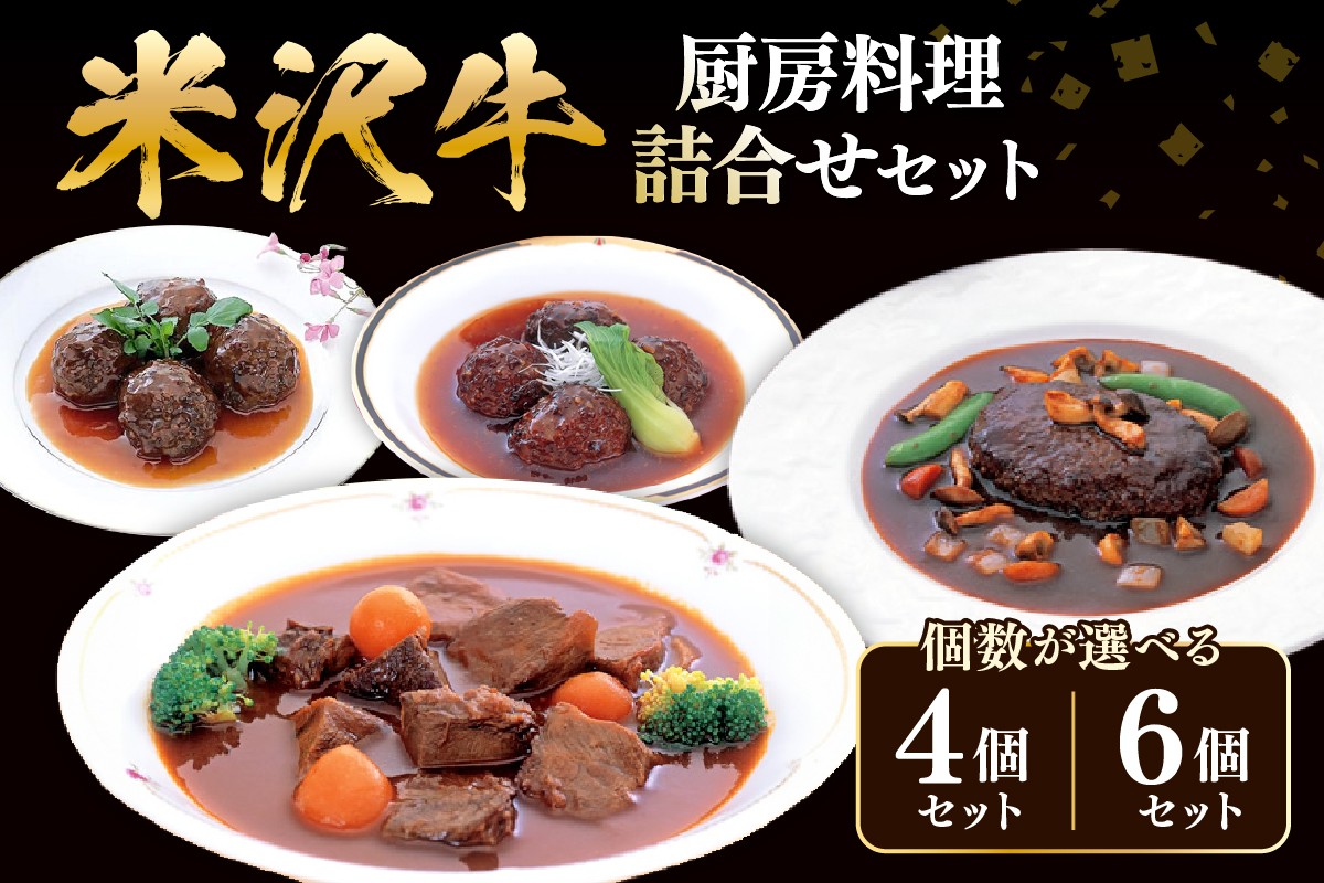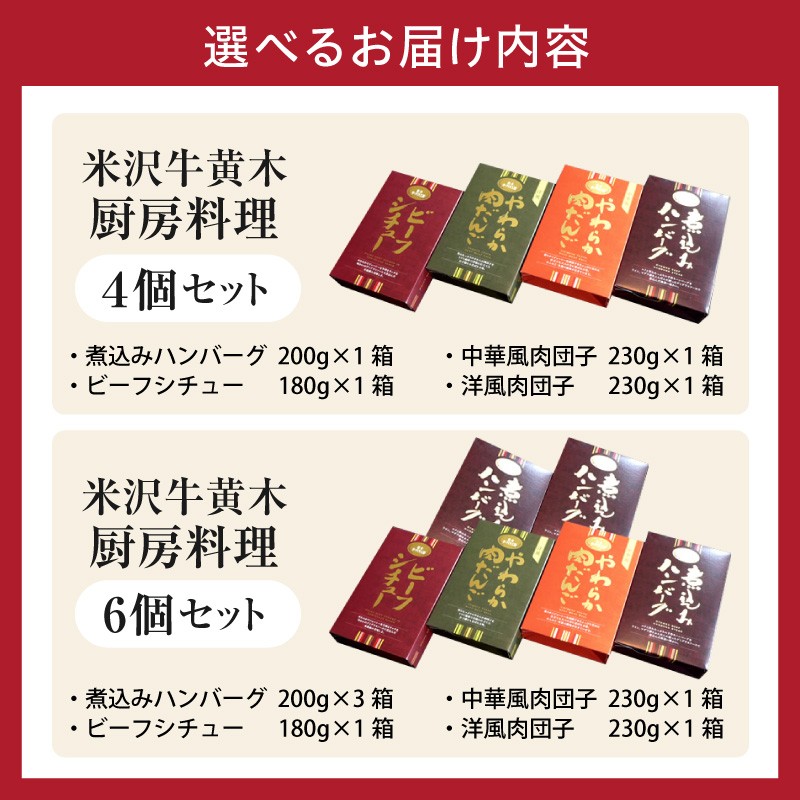 湯煎で本格レストランの味 米沢牛黄木 シェフ直伝 黒毛和牛 厨房料理 セット 米沢牛黄木 厨房料理 4種 詰め合わせ セット 4個 または 6個 煮込みハンバーグ ビーフシチュー 中華風肉団子 洋風肉団子 湯煎 温めるだけ レトルト 惣菜 山形県 米沢市