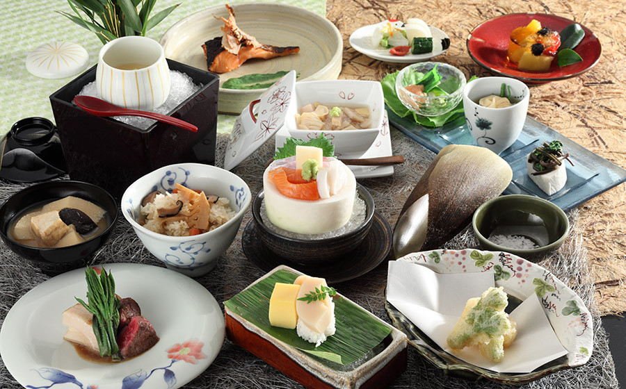 旬の食材を贅沢に盛り込んだ会席膳は四季の旬味を堪能できる。