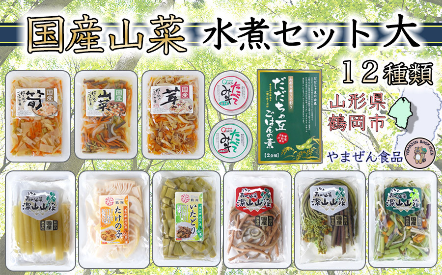 | 容量 | ①国産ぜんまい水煮 (60g) ②国産わらび (100g) ③国産山ぶき (90g) ④国産山菜ミックス (100g) ⑤鶴岡産たけのこスライス (150g) ⑥鶴岡産いたどりカット (130g) ⑦だだちゃ豆ご飯の素(2合用) ⑧国産山菜ごはんの素(2合用) ⑨国産筍ごはんの素(2合用) ⑩国産茸ご飯の素(2合用) ⑪うど入なんばんみそ(150g) ⑫ばんけみそ(150g) 各1袋(個)ずつ 【提供事業者】(有)やまぜん食品 |