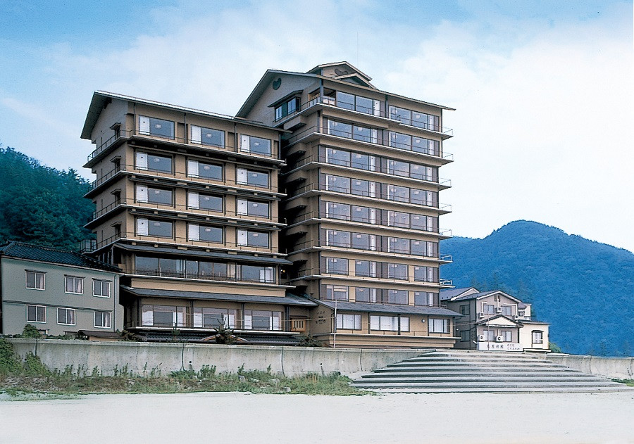 温海川の畔に佇む近代和風大型旅館。 あつみ温泉『萬国屋』の1泊2食付ペア宿泊券。