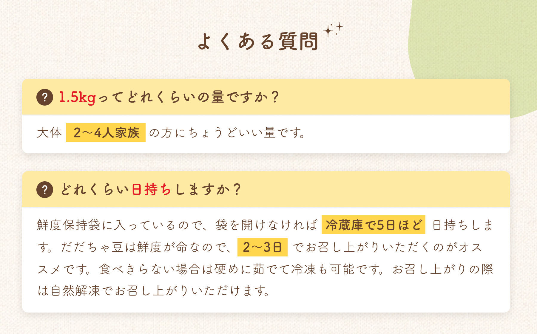 | 容量 | だだちゃ豆(早生甘露) 1.5kg (500g×3袋) 【提供事業者】だだちゃ喜左衛門株式会社 |