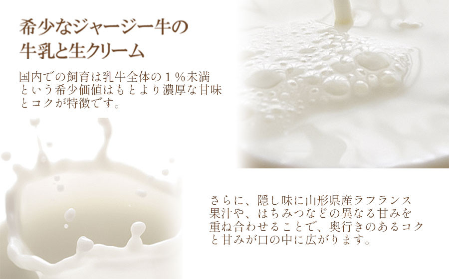 厳選された小麦粉、希少なジャージー牛の生クリームや牛乳など、とことん素材にこだわりました。さらに、隠し味に山形県産ラフランス果汁や、はちみつなどの異なる甘みを重ね合わせることで、奥行きのあるコクと甘みが口の中に広がります。