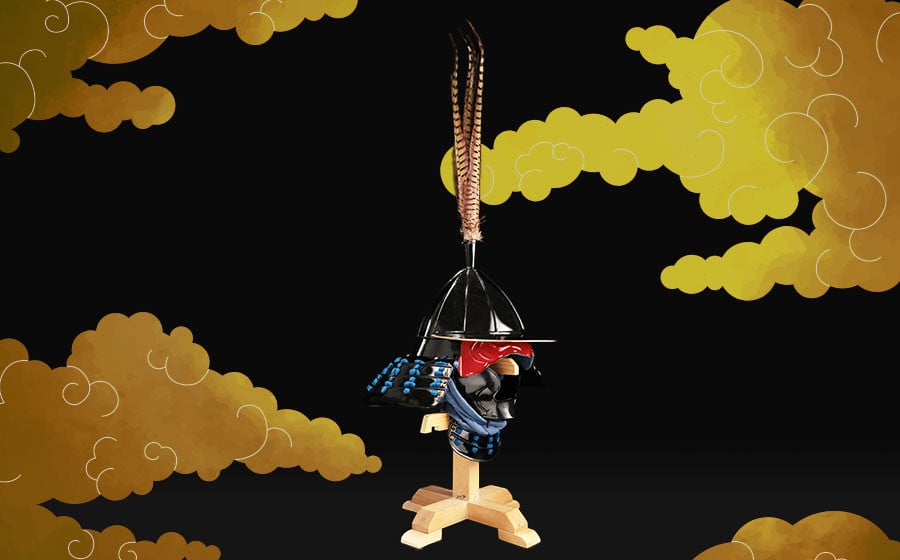 立物は頭立に雉の尾の掴差を設け、𩊱は杉形四段で花糸素懸威、面具は猿頬の半頬となり三段の素懸の垂になります。