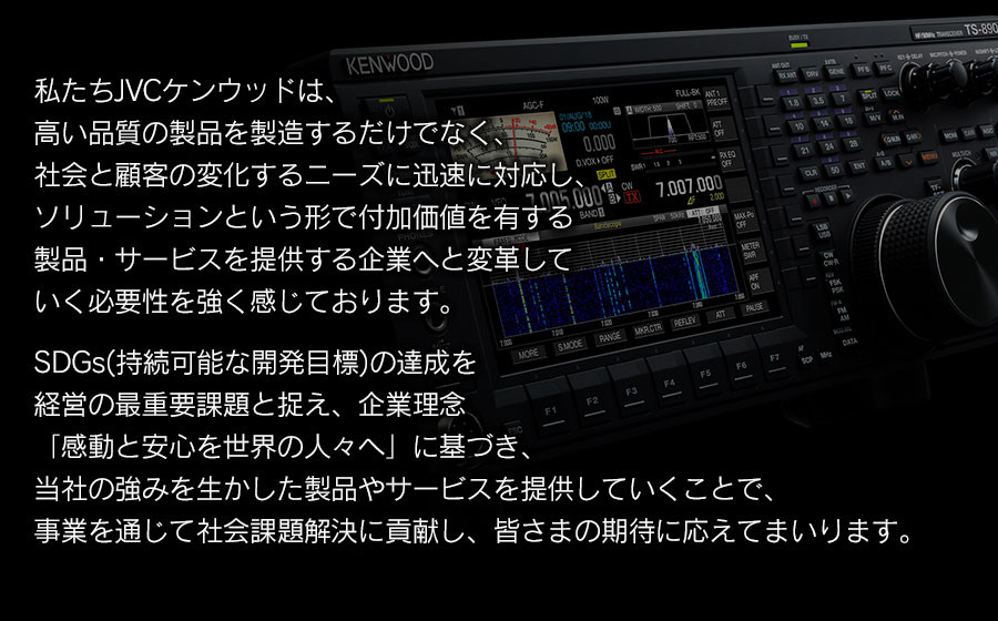 私たちJVCケンウッドは、高い品質の製品を製造するだけでなく、社会と顧客の変化するニーズに迅速に対応し、ソリューションという形で付加価値を有する製品・サービスを提供する企業へと変革していく必要性を強く感じております。