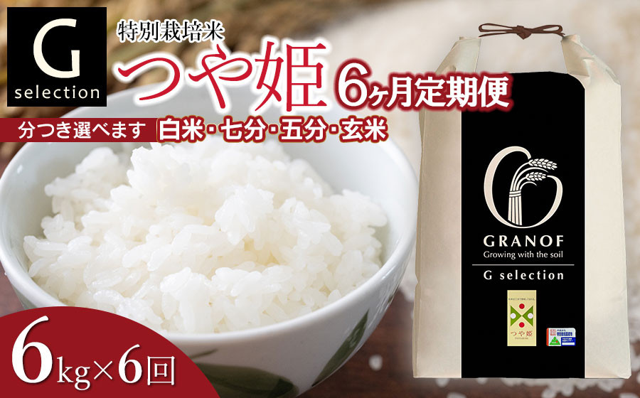 チョイスPayポイントと交換できる品 精米加減:白米・七分つき・五分つき・玄米から対応いたします。 【令和7年産】【新米】【定期便6ヶ月】 特別栽培米 Gセレクション つや姫 精米 6kg (6kg×1袋)×6ヶ月 山形県鶴岡市産 株式会社グラノフ