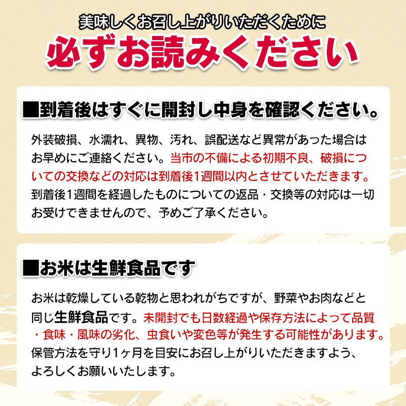 | 消費期限 | お届け日より1ヶ月以内にお召し上がりください。 直射日光、高温多湿を避け冷暗所で保管してください。 ※お米は野菜やお肉などと同じ「生鮮食品」です。 未開封でも月日の経過や保管方法によっては品質・食味・風味の劣化、虫食いや変色等が発生する可能性があります。 |