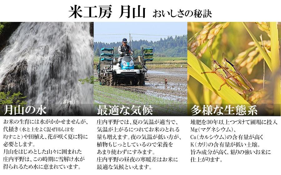 さらにマグネシウム、カルシウムの含有量が高くカリの含有量が低い土壌なので旨み成分が高く、粘り強いお米に仕上がります。この3点が米工房月山のおいしさの秘訣です。