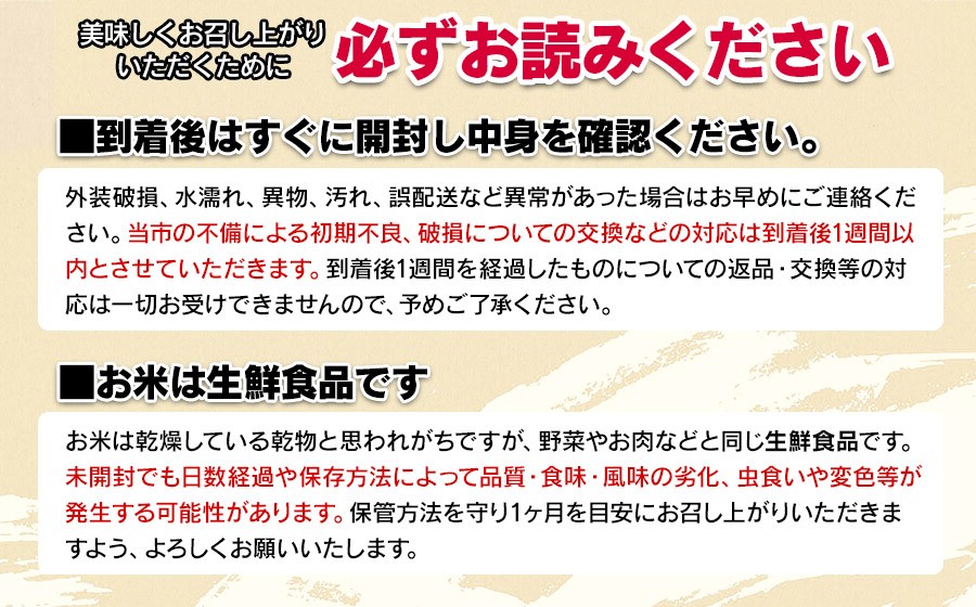 | 消費期限 | 到着後は1ヶ月(梅雨・夏時期は2~3週間)を目安にお早めにお召し上がりください。 直射日光、高温多湿を避けて涼しく暗い場所で保管してください。 ※お米は野菜やお肉等と同じ「生鮮食品」です。 未開封でも月日の経過や保管方法によっては品質・食味・風味の劣化、虫食いや変色等が発生する可能性があります。 |