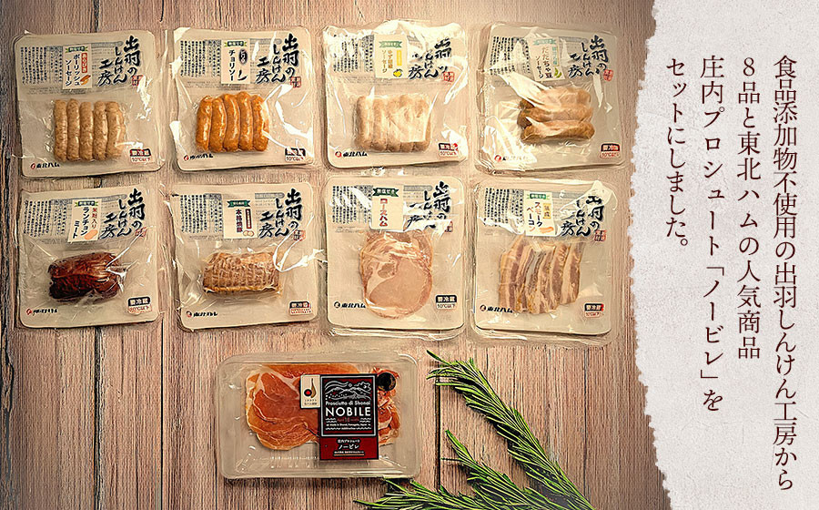 無添加の出羽しんけん工房から8品と東北ハムの人気商品庄内プロシュート「ノービレ」をセットにしました。