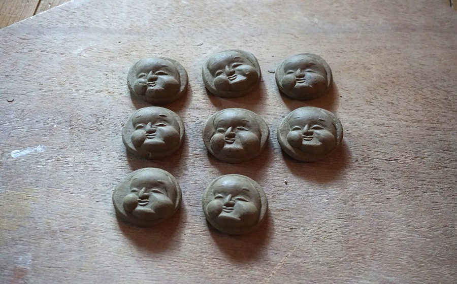 陶中村の先々代・先代は和菓子屋を営んでおり、菓子製造に使われていた木型を粘土用として受け継ぎおかめちゃんシリーズを制作しました。