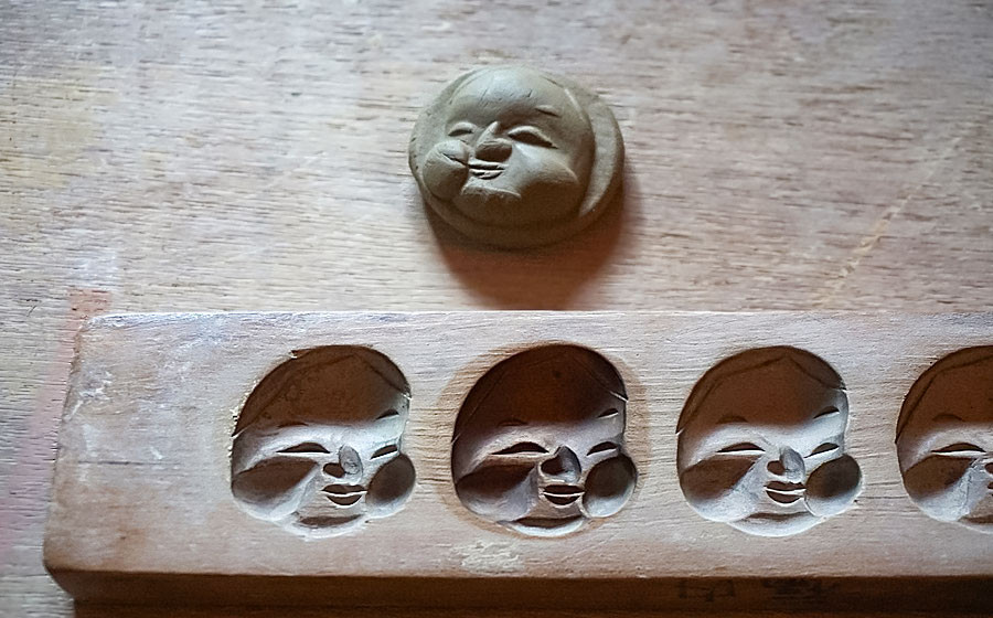 陶中村の先々代・先代は和菓子屋を営んでおり、菓子製造に使われていた木型を粘土用として受け継ぎおかめちゃんシリーズを制作しました。