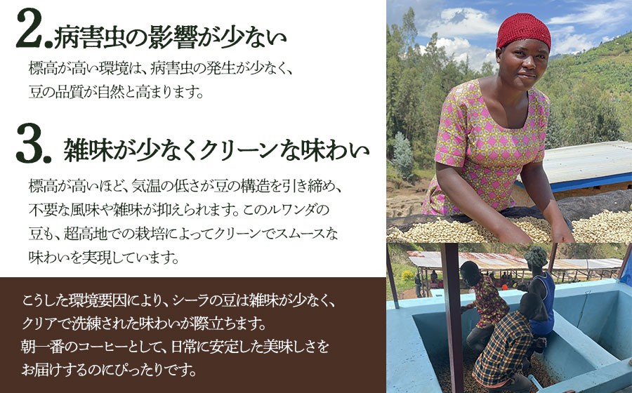 ルワンダのシーラ コーヒーウォッシングステーションで栽培されたこの豆は、1850m〜2300mという超高地で育てられています。高標高で栽培されるコーヒー豆には、以下の特徴があります