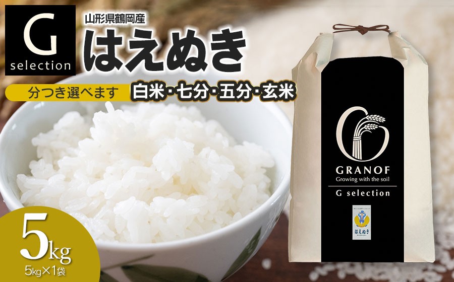 チョイスPayポイントと交換できる品 【令和7年産】【新米】 Gセレクション はえぬき 5kg(5kg×1) つき加減(精米加減)が選べる(玄米・五分づき・七分づき・白米)山形県鶴岡市産 株式会社グラノフ