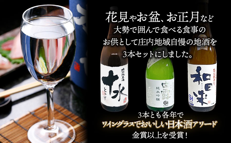 花見やお盆、お正月など大勢で囲んで食べる食事のお供として庄内地域自慢の地酒を3本セットにしました。