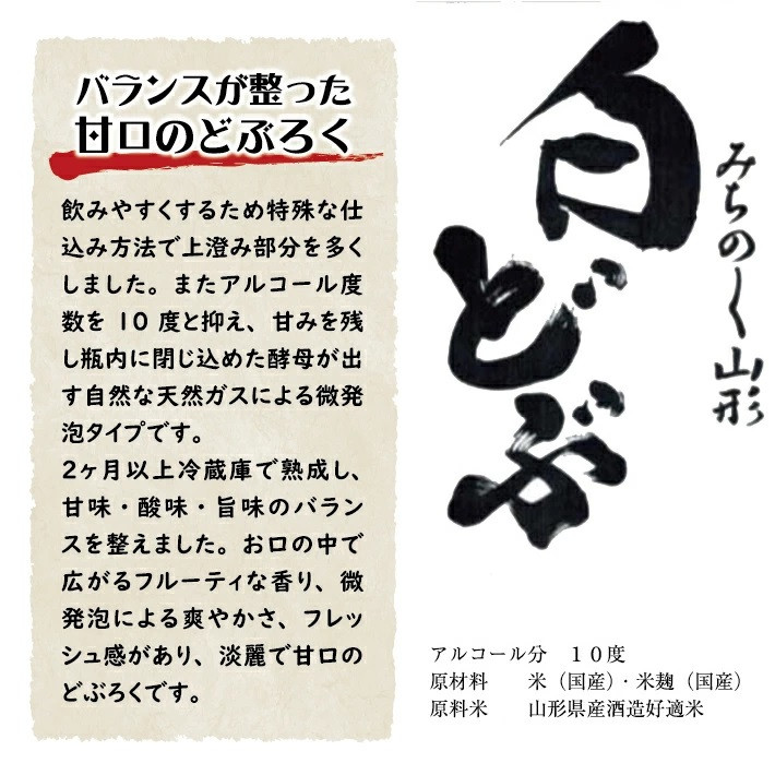 特殊な仕込み方法で上澄みの割合を多くした飲みやすいどぶろく。微発泡による爽やかさがあり、 淡麗、やや甘口でお料理との相性が抜群です。