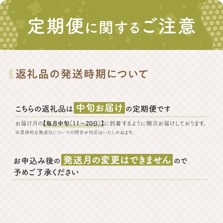 | 発送期日 | ご入金の翌月より 2ヶ月連続 毎月中旬(11日~20日頃)にお届け |