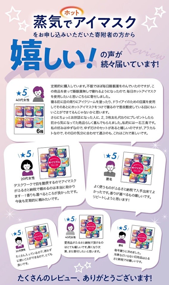 チョイスPayポイントと交換できる品 花王酒田工場で製造 ラベンダー・完熟ゆず・金木犀の3種類の香り めぐりズム 蒸気めぐるアイマスク【アラカルト3種セット】 30枚(各5枚入×2箱) SA2693