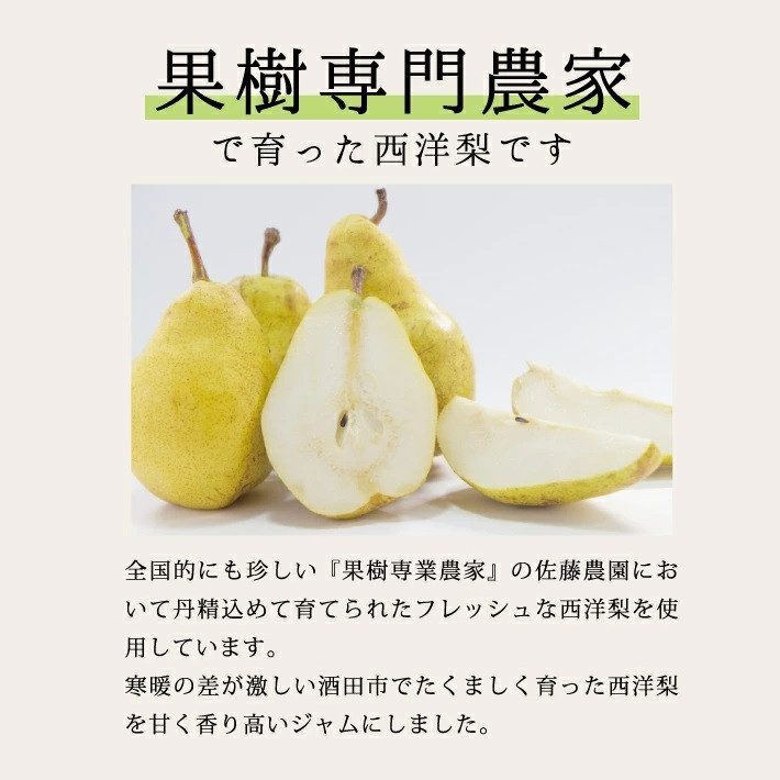 寒暖の差が激しい庄内でたくましく育った西洋梨を甘く香り高いジャムにしました。