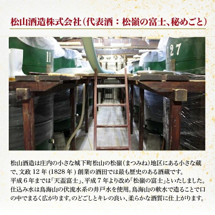 松山酒造は庄内の小さな城下町松山の松嶺(まつみね)地区にある小さな蔵で、文政12年(1828年)創業の酒田では最も歴史のある酒蔵です。平成6年までは「天盃富士」、平成7年より改め「松嶺の富士」といたしました。
