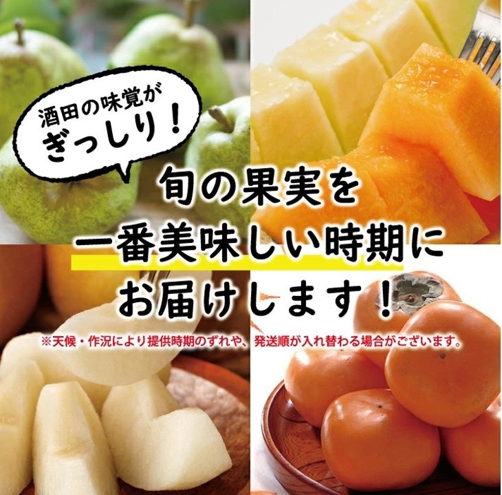 チョイスPayポイントと交換できる品 庄内の味覚がぎっしり詰まったコース! 年4回おいしいフルーツを旬の時期にお届け 【4回定期便】酒田の季節のフルーツ頒布会Aコース 2026 6月下旬~8月上旬 プレミアムメロン 8月下旬~10月上旬 刈屋梨(和梨) 10月下旬~11月中旬 庄内柿 11月上旬~11月下旬 ラ・フランス ※着日指定不可 くだもの JA 農協 産地直送 西洋梨 夏 秋 冬 JA庄内みどり SF0301