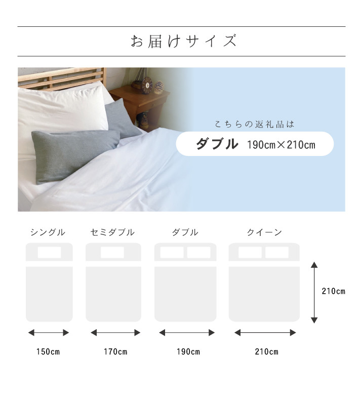 | 容量 | 羽毛布団(ダブルサイズ)1枚 ・サイズ:横190cm×縦210cm ・羽毛:ホワイトグースダウン 93% ・ダウンパワー:410dp ・羽毛充填量:1.75kg ・側生地:綿100%(60サテン) ・側生地色:ホワイト(無地) |