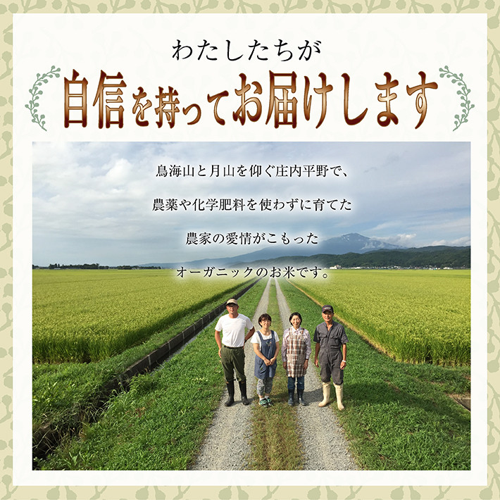 【鳥海山と月山を仰ぐ庄内平野で、除草剤や化学肥料を使わずに育てたオーガニックのお米です】