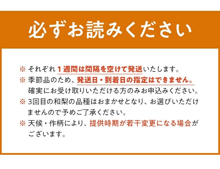 | 容量 | 受付:2026年7月23日(木)ご入金分まで ※配送日・到着日の指定不可。 各回、約3kg※玉数は指定不可、玉数はサイズにより異なります。 【1回目】2026年8月下旬~9月中旬 幸水梨 【2回目】2026年9月中旬~10月中旬 豊水梨 【3回目】2026年9月下旬~10月下旬 和梨(品種おまかせ/あきづき、南水、新興梨) |