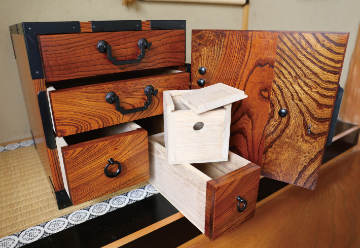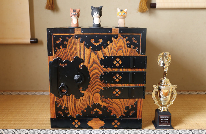 加藤木工が作る「船箪笥」です。木目の美しい欅を外装に使用し、拭き漆で仕上げました。フランス・パリの美術展覧会で受賞した作品と同等品です。