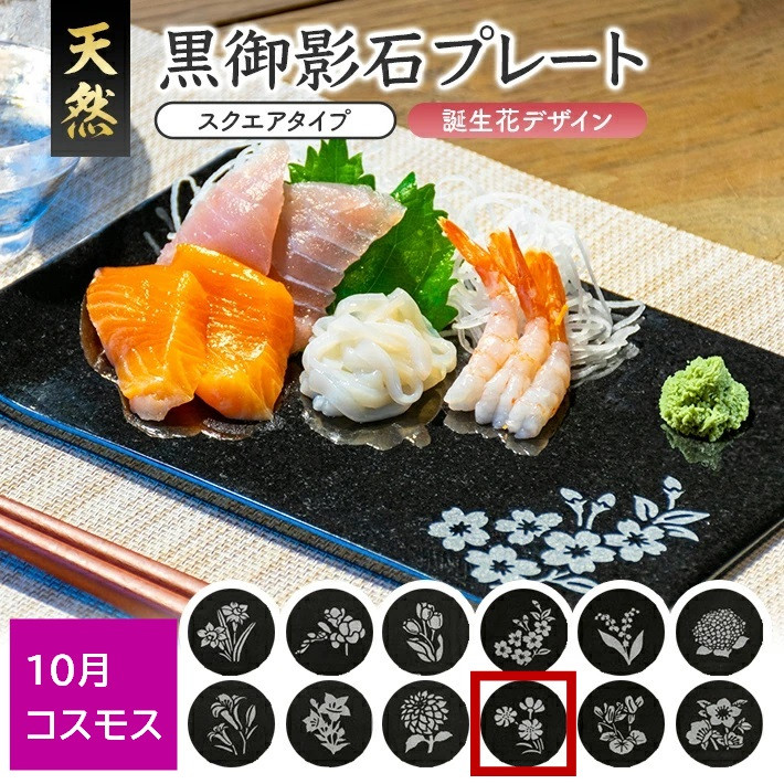 チョイスPayポイントと交換できる品 熟練の職人手作り! 天然石使用 保温・保冷に優れた長方形のお皿です 天然黒御影石 スクエアプレート 1枚 【誕生花彫刻(10月コスモス)】 SE0265