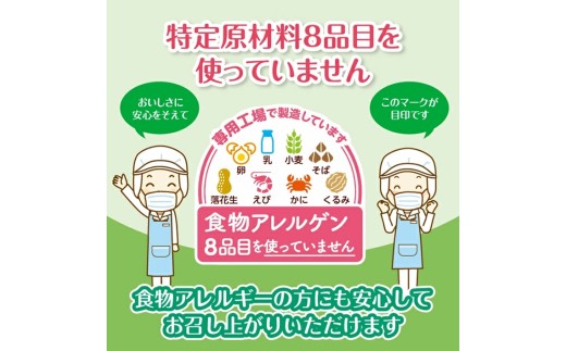 ●特定原材料8品目(卵・乳・小麦・そば・落花生・えび・かに・くるみ)を使用しない食物アレルギー対応専用工場で、製造しています。
