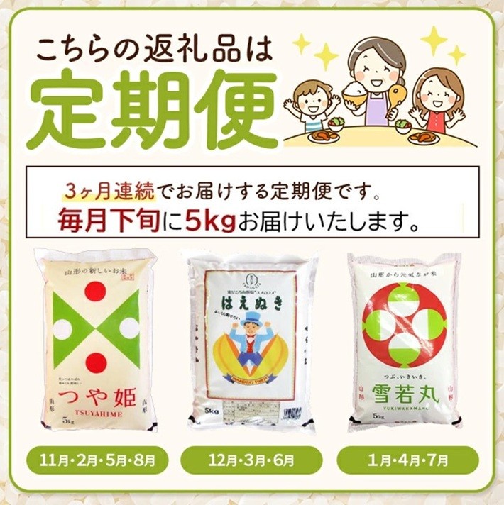 「山形のおすすめのお米3銘柄」を順番に毎月5kg、ご入金の翌月下旬より3ヶ月連続でお届けいたします。