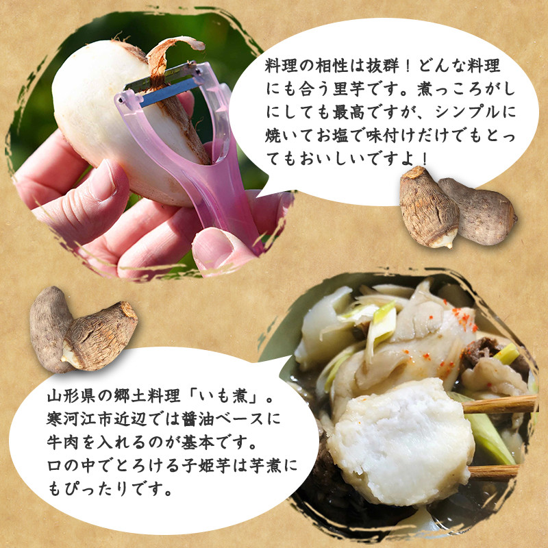 今では定番の山形の郷土料理「いも煮」以外にも、煮っころがし、素揚げ、唐揚げ、コロッケ、アヒージョ、グラタンなど様々なアレンジレシピも開発されており、どんな調理方法にも合う里芋です。