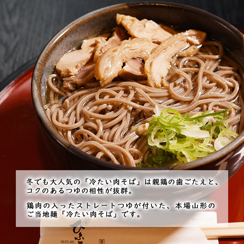 冬でも大人気の「冷たい肉そば」は親鶏の歯ごたえと、コクのあるつゆの相性が抜群。鶏肉の入ったストレートつゆが付いた、本場山形のご当地麺「冷たい肉そば」です。