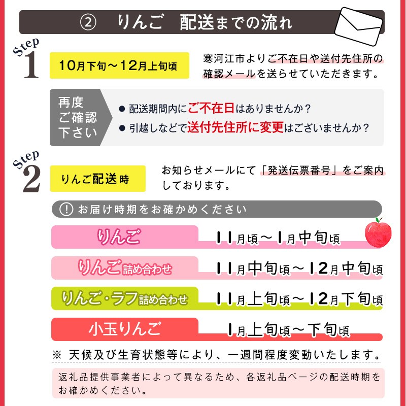 ・青果物は気候や生育状況により配送時期が変動する場合がございます。生育状況により収穫量・発送件数は変わるため、事前に発送予定日のご連絡はできません。