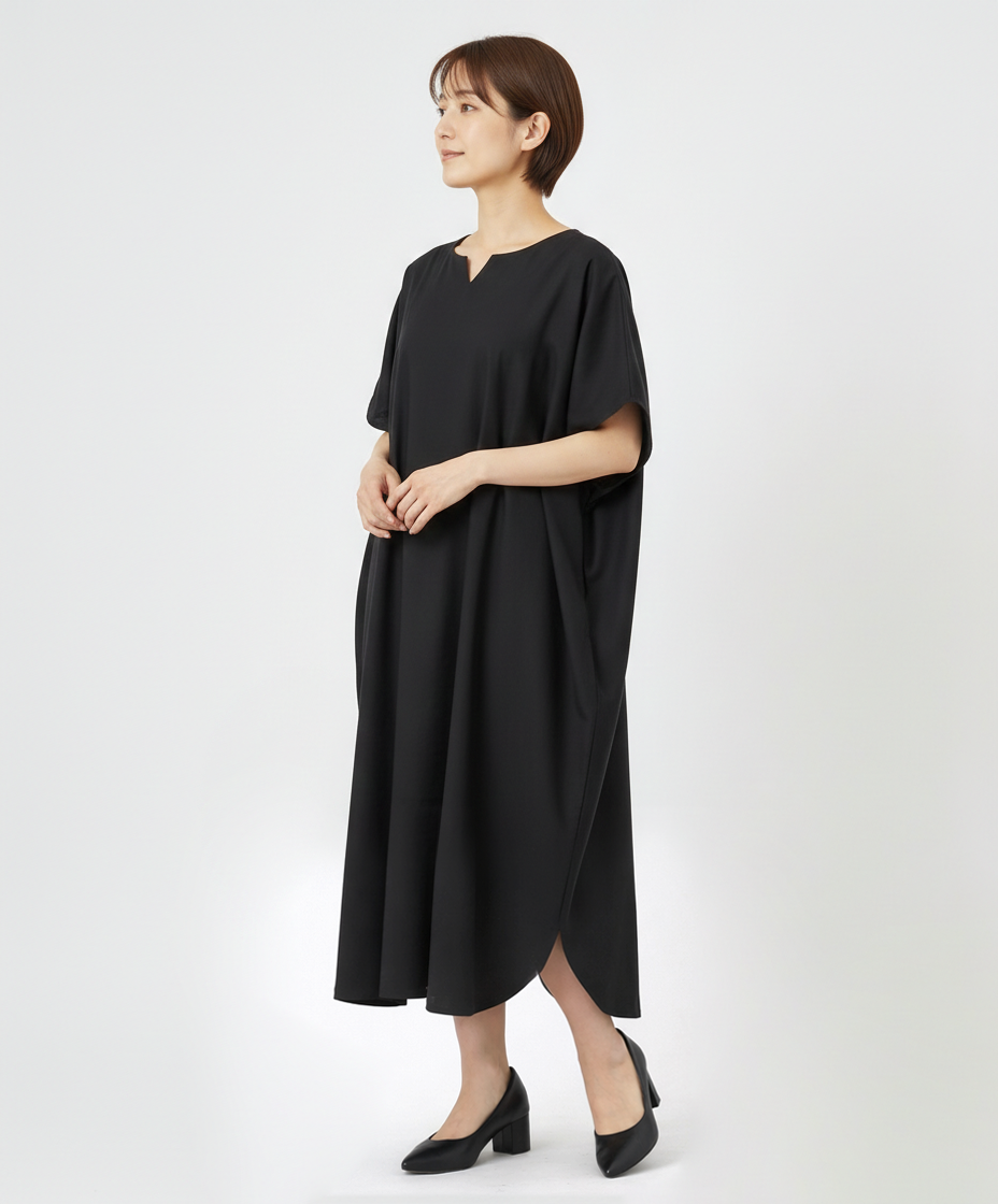 MARUTAは山形のもの作りにこだわったアパレルブランド 洗える 天然素材 ワイドドレープワンピース 日本製ブラックフォーマル素材使用 / シルクのような肌触り シワになりにくい ワンピース フリーサイズ オールシーズン対応 着心地抜群 MARUTA 春 夏 秋 冬 通年 シンプル 着回し ojohn 山形県寒河江市 088-H-OJ002