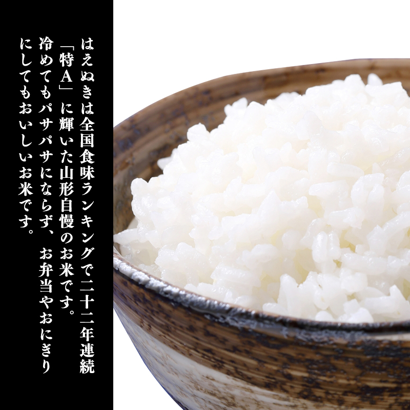米の食味ランキングにおいて、「外観・「香り」・「味」・「粘り」・「硬さ」などの総合評価で高い評価を得ている米どころ山形の主力品種であり、10年の歳月をかけて研究・育成された山形県オリジナル品種が「はえぬき」です。