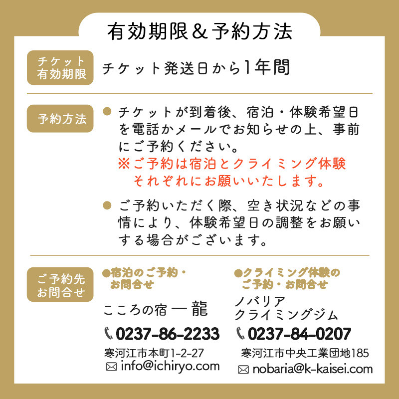 【スポーツクライミング体験&源泉かけ流し温泉と旬のお料理を堪能!】 《初めてでも安心》 クライミング体験 と 源泉かけ流し温泉 宿泊券(1泊2食付き) 1名様分/クライミング 体験 ホテル 旅館 宿泊券 チケット 温泉 露天風呂 旅行 夕食 山形牛 こころの宿 一龍 ノバリア クライミングジム スポーツ 東北 山形 寒河江 067-J-IR001