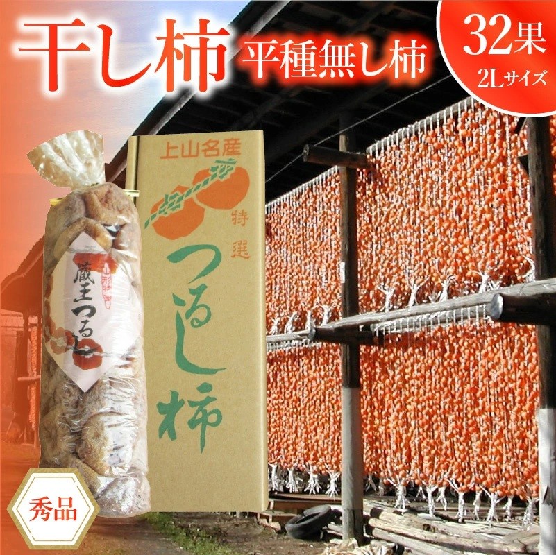 | 容量 | 干し柿(平種無し柿)32果 2Lサイズ 秀品 ※天候により出荷時期や規格(数、サイズ、品種等)を変更する場合がございます。 |