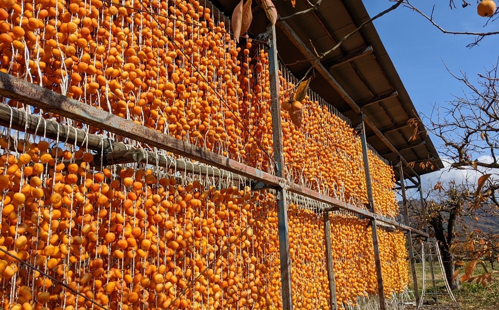 上山原産の渋味の強い紅柿は、冠雪の山々から吹き降ろす冷たい風と、日中の柔らかい日差しにより濃厚な甘味の干し柿になります。