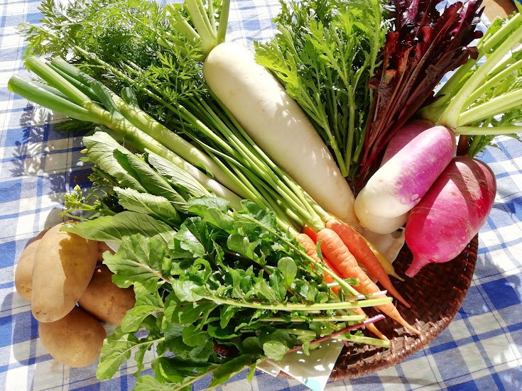 | 容量 | LLサイズ 季節のおまかせ野菜を12種類以上箱いっぱいに詰めます <一例> じゃがいも(紅あかり、マチルダ等)、京紫大根、人参、赤玉ねぎ、サラダ赤カブ、シャインカブ、ルタバガ(スウェーデンカブ)、ほうれん草、紫からし菜、里芋、雪菜、かぼちゃ、春菊、ルッコラ、白菜、水菜、ニンニク、紅くるり大根、紅芯大根、大和真菜、雪白体菜、エディブルフラワービオラ、小松菜、ラディッシュ…… ※野菜の指定はできません。 ※収穫状況により野菜の種類は異なります。 ※天候により出荷時期や規格(数、サイズ、品種等)を変更する場合がございます。 |