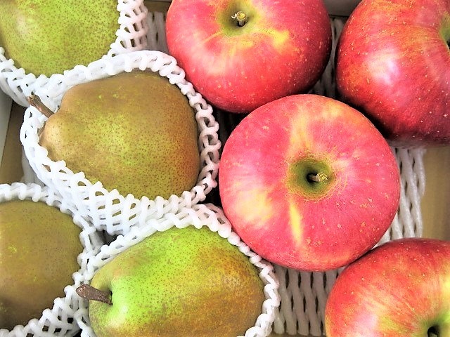 ラ・フランスと葉とらず栽培の味が濃いサンふじりんごの詰合せです。それぞれ半分ずつ入る予定です。
