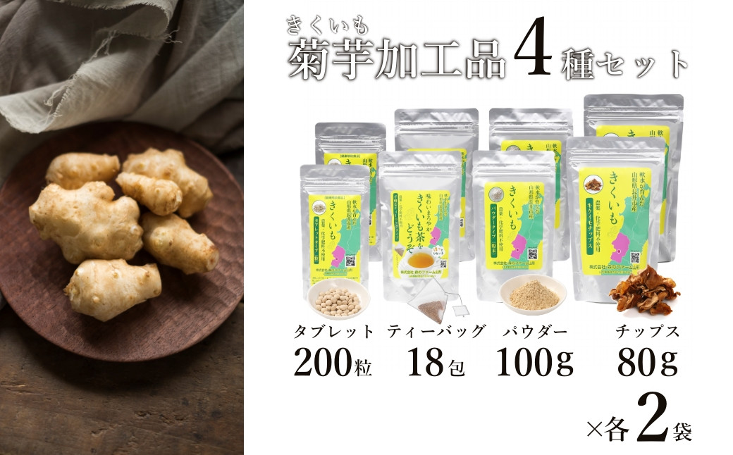 水溶性食物繊維イヌリンを豊富に含むキクイモ食品!お通じが気になる方に! 長井産菊芋(きくいも)4種セット(チップス、パウダー、タブレット、ティーバッグ 各種2袋)_E129