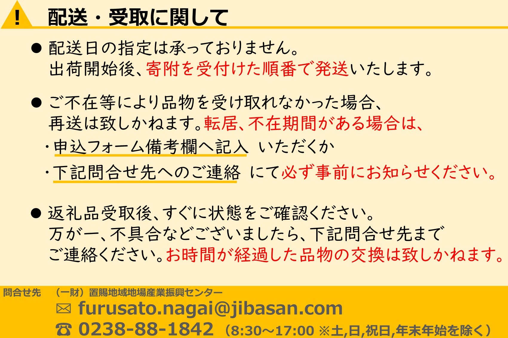 ・お礼の品については万全を期しておりますが、万が一品質等に関しお気づきの点があればご連絡ください。