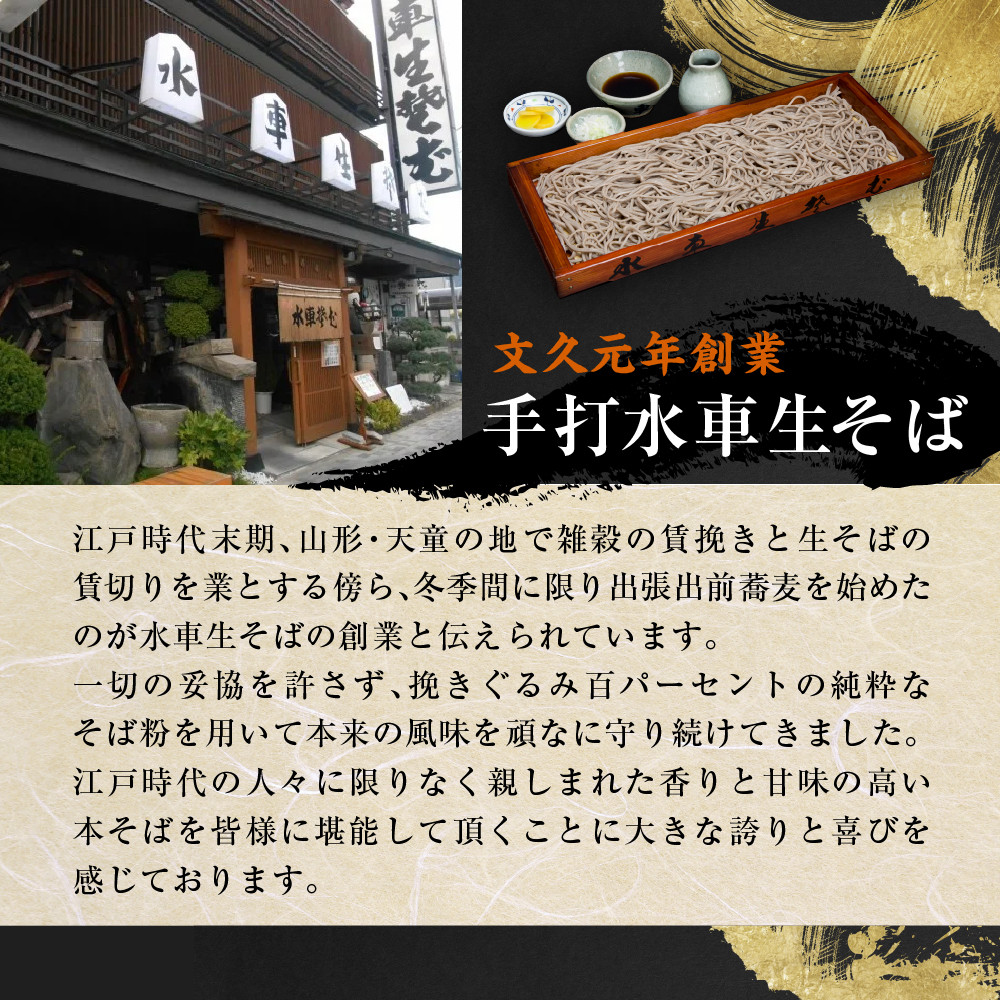 当店は、天童の地で江戸時代の末期、文久元年(1860年)雑穀の賃挽きと生そばの賃切りを業とする傍ら、 11月~3月迄の冬季間に限り、出張出前蕎麦を始めたのが水車生そばの創業と伝えられています。 大きな水車を廻し石臼で甘皮から胚芽の部分やそばの芯まで選別することなく粉に挽いて、 一切の妥協を許さず挽きぐるみ百パーセントの純粋なそば粉を用いて本来の風味を頑なに守り続けてきました。江戸時代の人々に限りなく親しまれた香りと甘味の高い本そばを皆様に堪能して頂くことに大きな誇りと喜びを感じております。