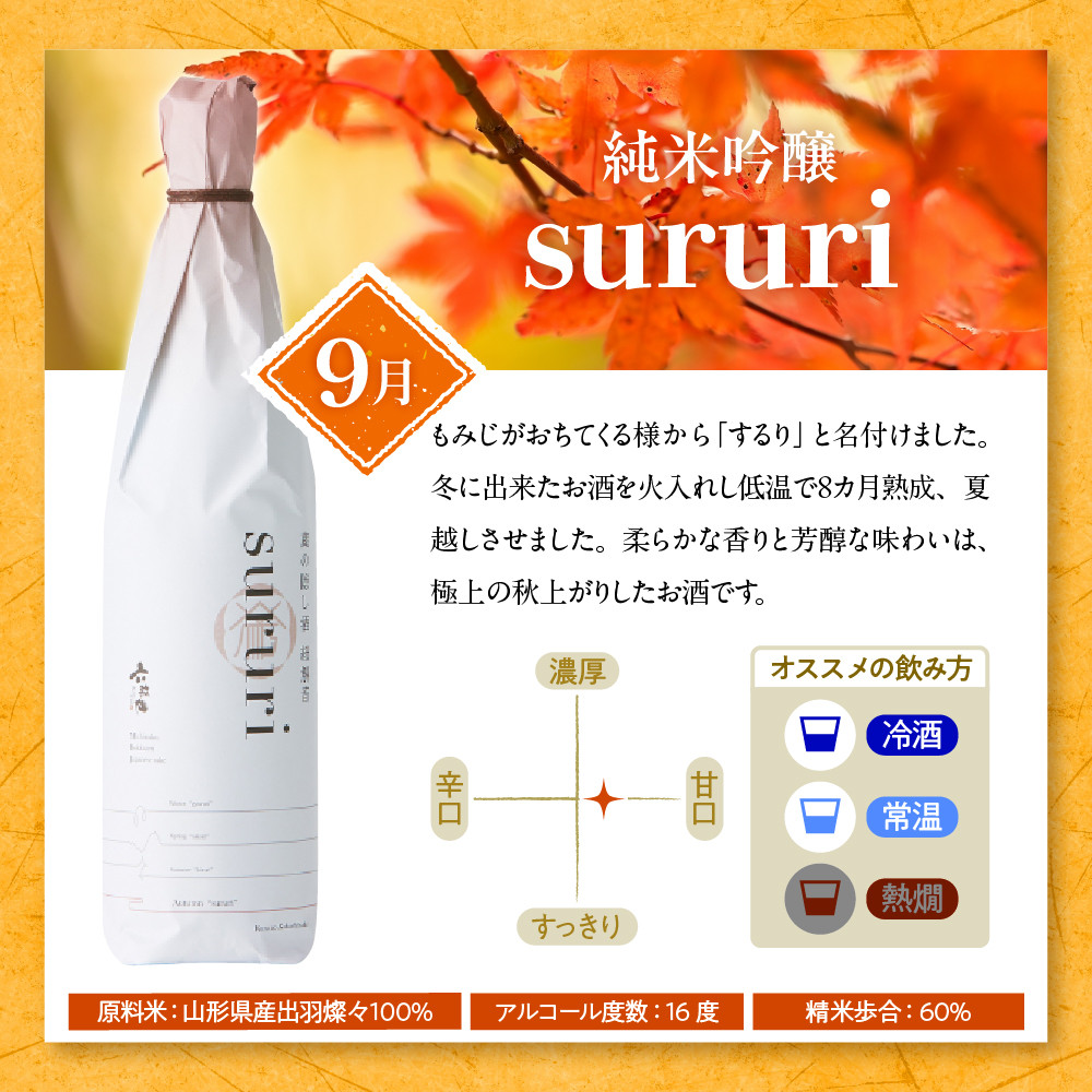 東根市唯一の酒造メーカー「六歌仙」のおいしいお酒です。 蔵の隠し酒は、四季で移り変わるお酒です。六歌仙×東北芸術工科大学「産学連携プロジェクト」で若者の意見をふんだんに取り入れネーミングとパッケージを一新! お酒を絞り出す音と動作に着目し、若者が手に取りたくなるようなデザイン、かつ、四季ごとに移り変わっていくお酒の味わいを表現したデザインになっています。 〇蔵の隠し酒 純米吟醸 【冬(12月):Gyururi(ぎゅるり)】 搾りたてならではのフレッシュな味わいと軽快な味わいが楽しめます。誕生したての味わいと米の旨味、華やいだ香りをお楽しみください。 【春( 3月):Sakuri(さくり)】 雪中にてゆっくりと熟成させました。米の柔らかな旨味、華やいだ香りとフレッシュ感に雪解けの波動がもたらす滑らかな味わいが楽しめます。 【夏( 6月) :Kirari(きらり)】 新酒を6ヶ月間じっくりと氷温貯蔵にて熟成させました。喉越しの良さに、シャープなキレのある爽やかな夏を思わせる香りをお楽しみください。 【秋( 9月):Sururi(するり)】 冬に出来たお酒を火入れし低温で熟成、夏越しさせました。柔らかな香りと芳醇な味わいは、 極上の秋上がりしたお酒です。 ■製造地 山形県東根市 ■提供事業者 発送元:東根市農業協同組合(よってけポポラ) 提供元:株式会社六歌仙 ■注意事項・その他 ※画像はイメージです。 ※受取後、すぐに返礼品の状態をご確認ください。 ※年末年始や中元お歳暮時期等の繁忙時期は、通常よりも発送までにお時間をいただく場合がございます。 ※天候・交通等により発送にお時間をいただく場合がございます。 ※20歳未満の飲酒は法律で禁止されています。